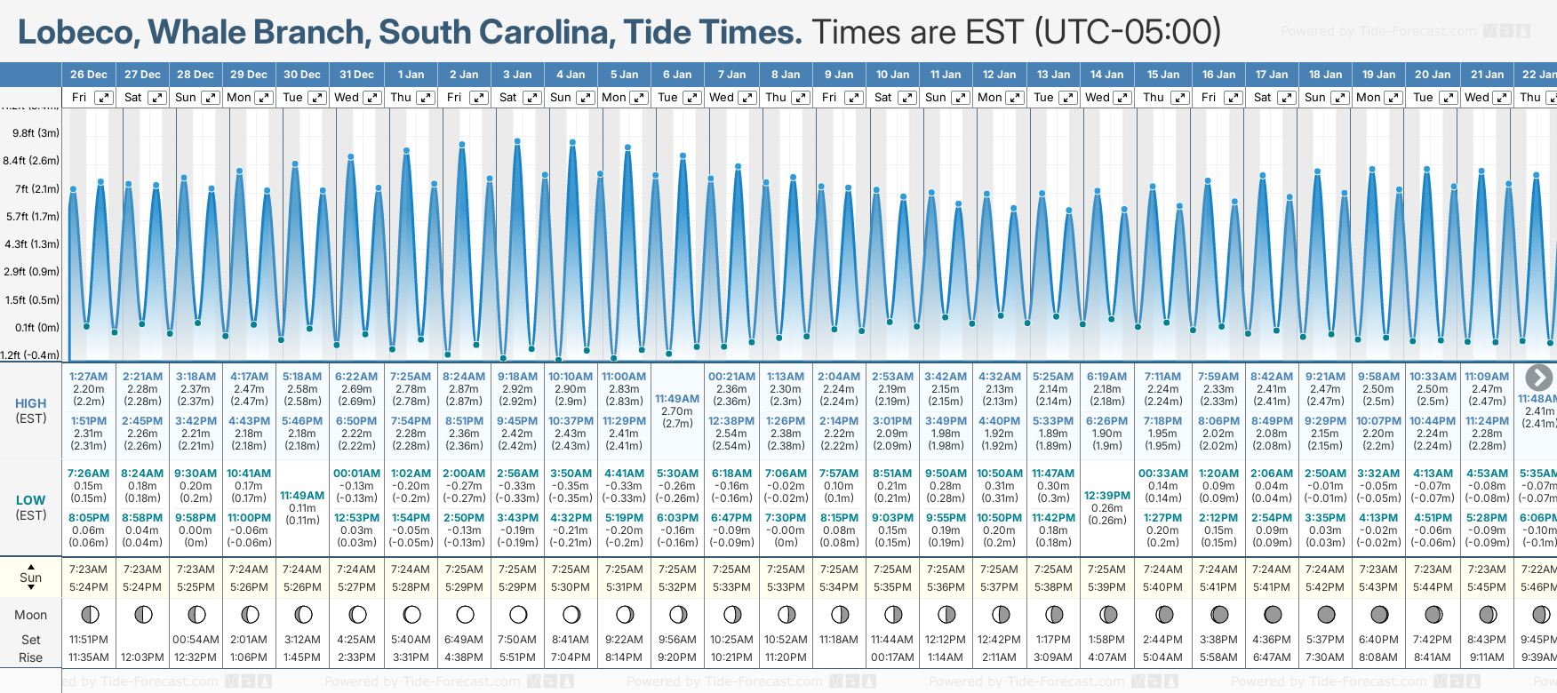 December and January Tide charts for Lobeco, Whale Branch: The tide charts below show the height, time and date of high and low tides for the next 30 days.
