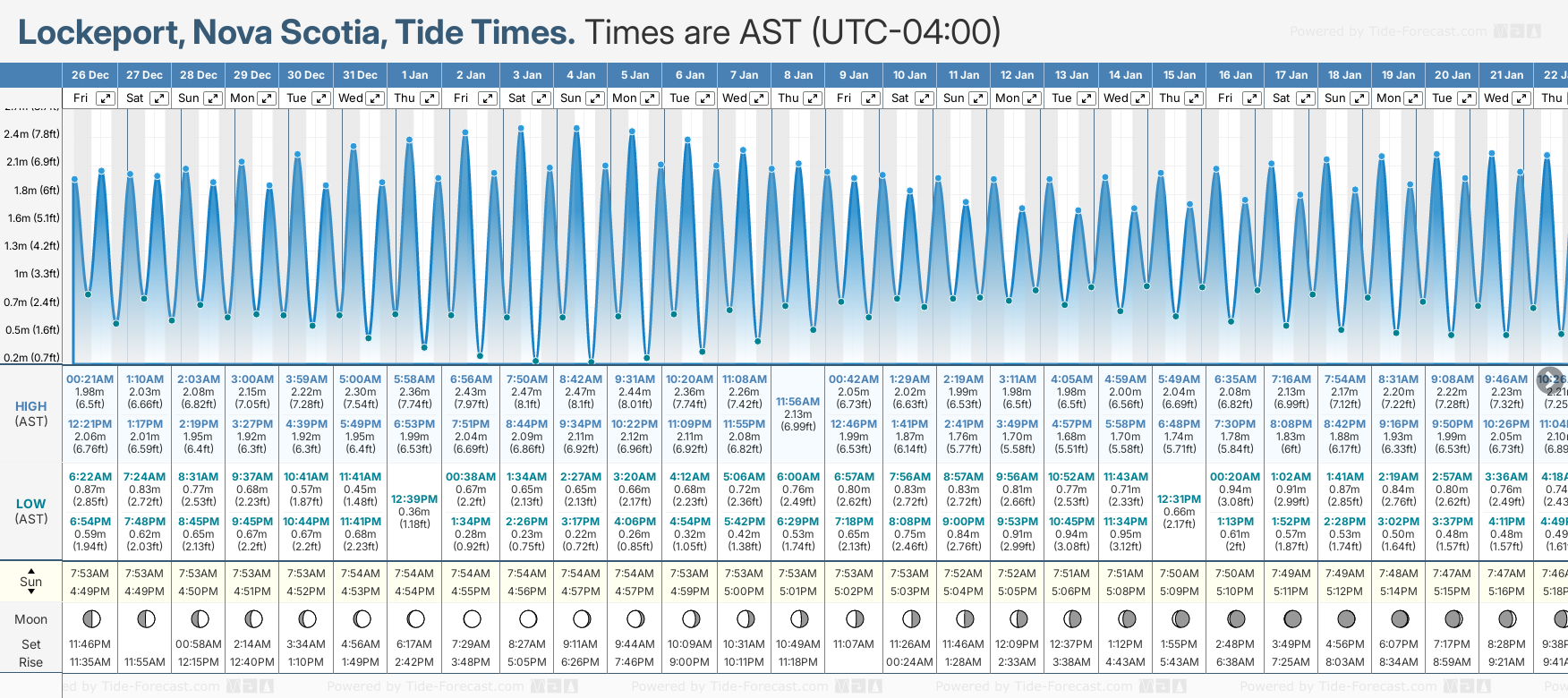 Tide chart for LockeportShowing low and high tide times for the next 30 days at Lockeport. Tide Times are AST (UTC -4.0hrs).
