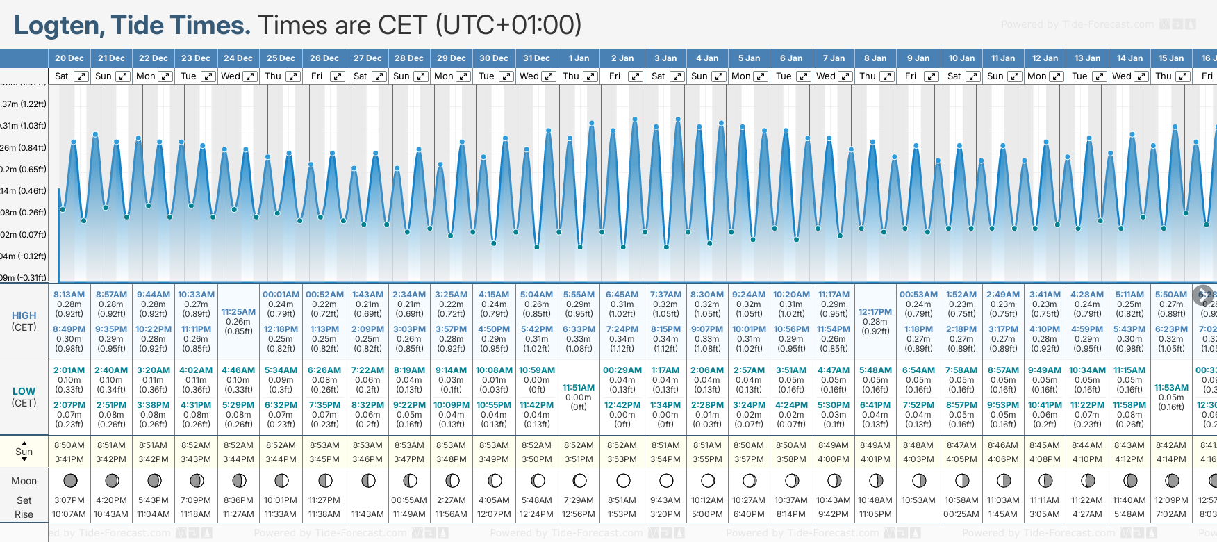 Tide chart for LogtenShowing low and high tide times for the next 30 days at Logten. Tide Times are CET (UTC +1.0hrs).