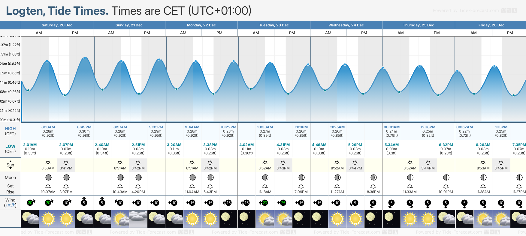 December and January Tide charts for Logten: The tide charts below show the height, time and date of high and low tides for the next 30 days.