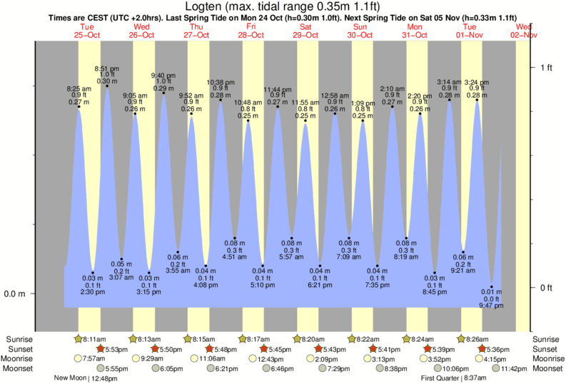 Tide Times are CET (UTC +1.0hrs). Last Spring High Tide at Logten was on Thu 18 Dec (height: 0.31m 1.0ft). Next high Spring Tide at Logten will be on Fri 02 Jan (height: 0.34m 1.1ft).
