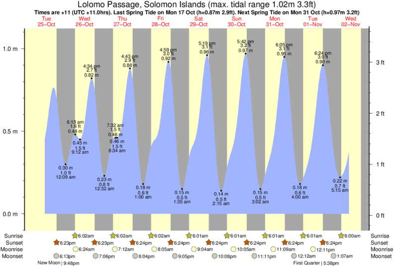 Tide Times are +11 (UTC +11.0hrs). Last Spring High Tide at Lolomo Passage was on Mon 08 Dec (height: 1.04m 3.4ft). Next high Spring Tide at Lolomo Passage will be on Mon 22 Dec (height: 0.93m 3.1ft).