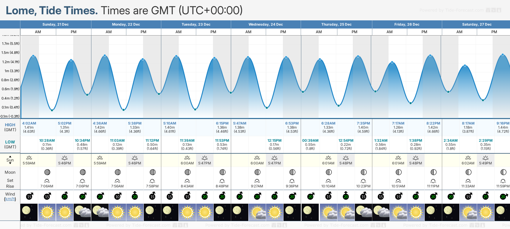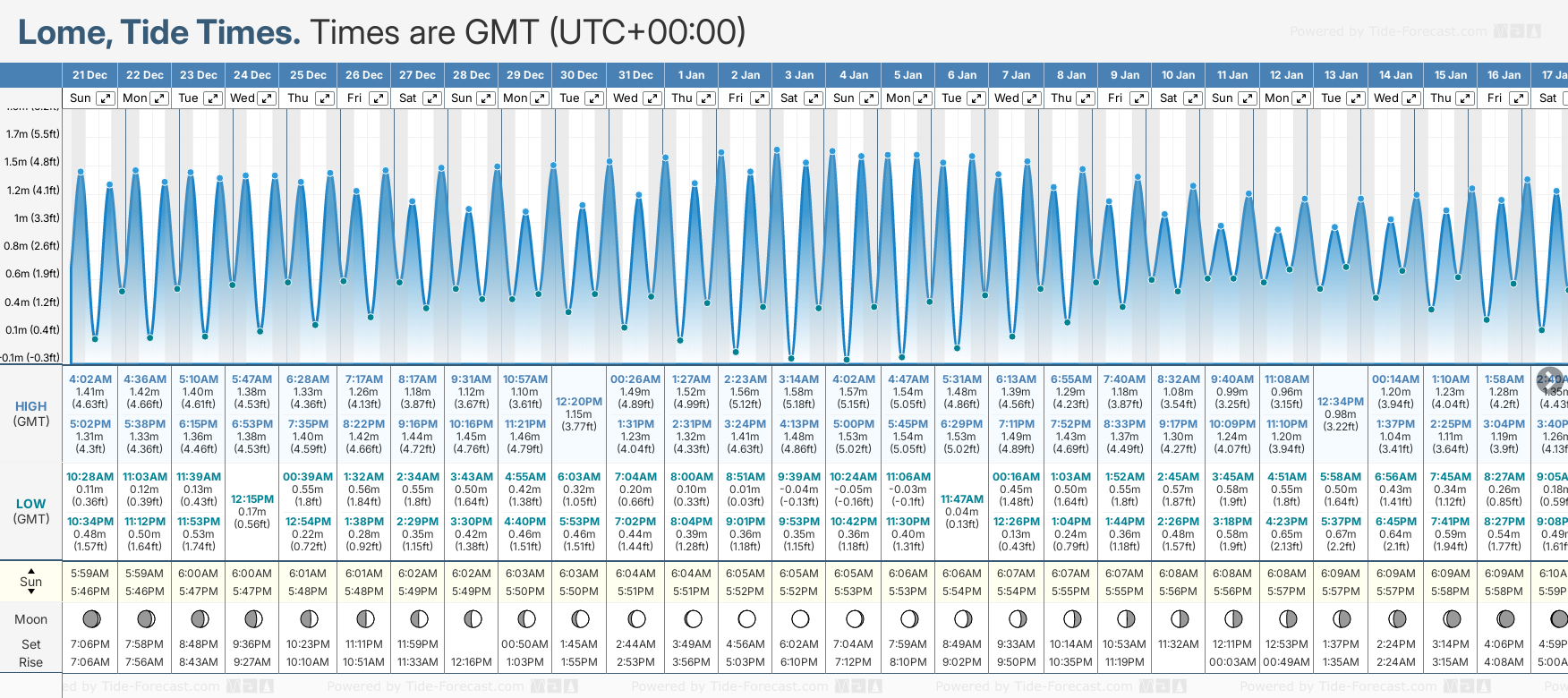 December and January Tide charts for Lome: The tide charts below show the height, time and date of high and low tides for the next 30 days.