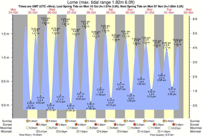 Tide Times are GMT (UTC +0hrs). Last Spring High Tide at Lome was on Thu 04 Dec (height: 1.67m 5.5ft). Next high Spring Tide at Lome will be on Mon 22 Dec (height: 1.42m 4.7ft).