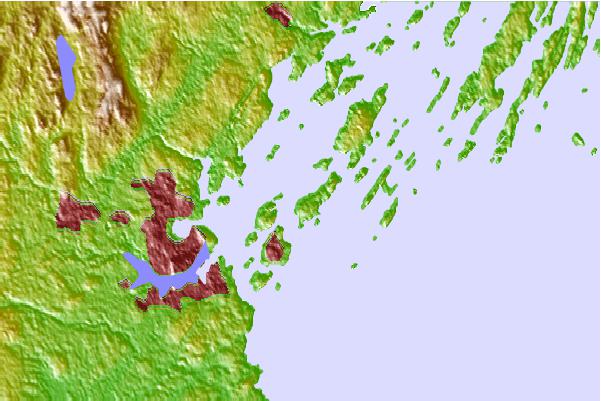 Use this relief map to navigate to tide stations, surf breaks and cities that are in the area of Long Island, Maine.