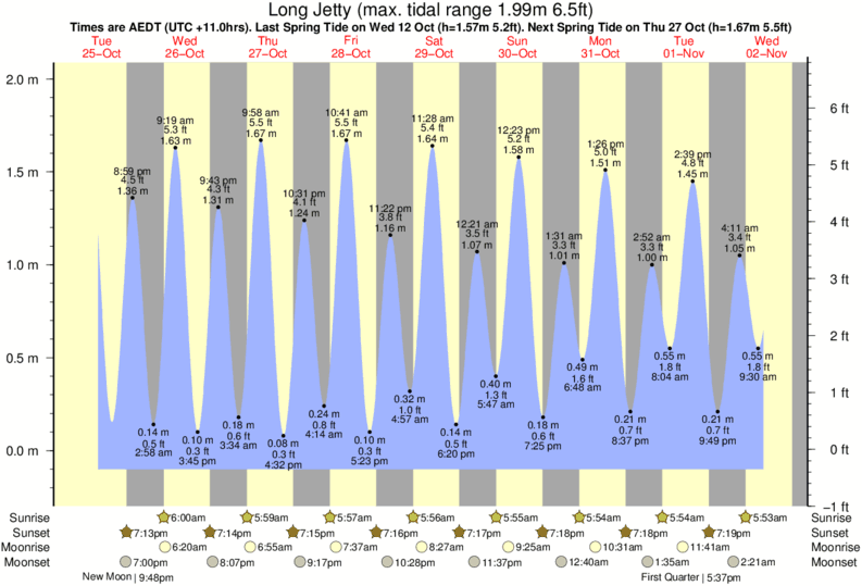 Tide chart for Long JettyShowing low and high tide times for the next 30 days at Long Jetty. Tide Times are AEDT (UTC +11.0hrs).