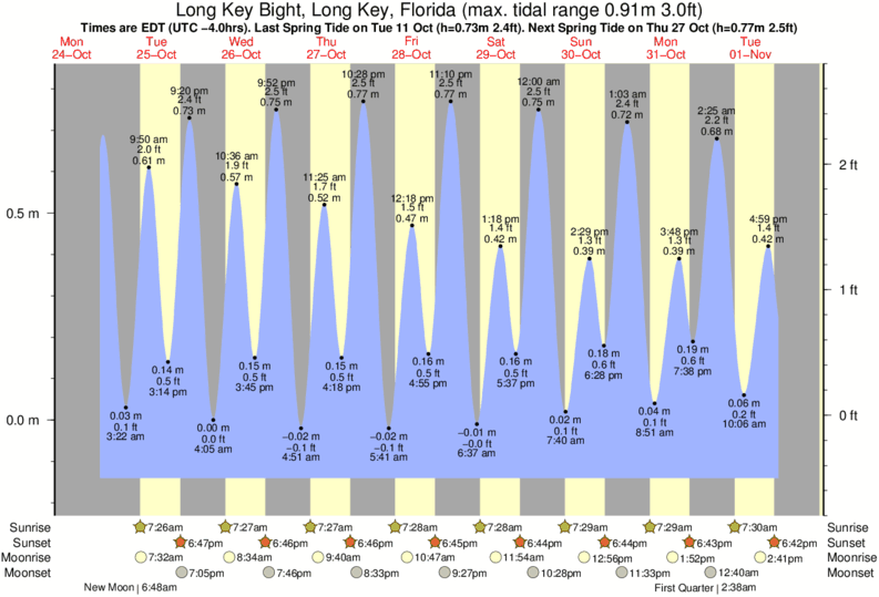 Tide Times are EST (UTC -5.0hrs). Last Spring High Tide at Long Key Bight, Long Key was on Fri 05 Dec (height: 0.74m 2.4ft). Next high Spring Tide at Long Key Bight, Long Key will be on Sun 21 Dec (height: 0.59m 1.9ft).