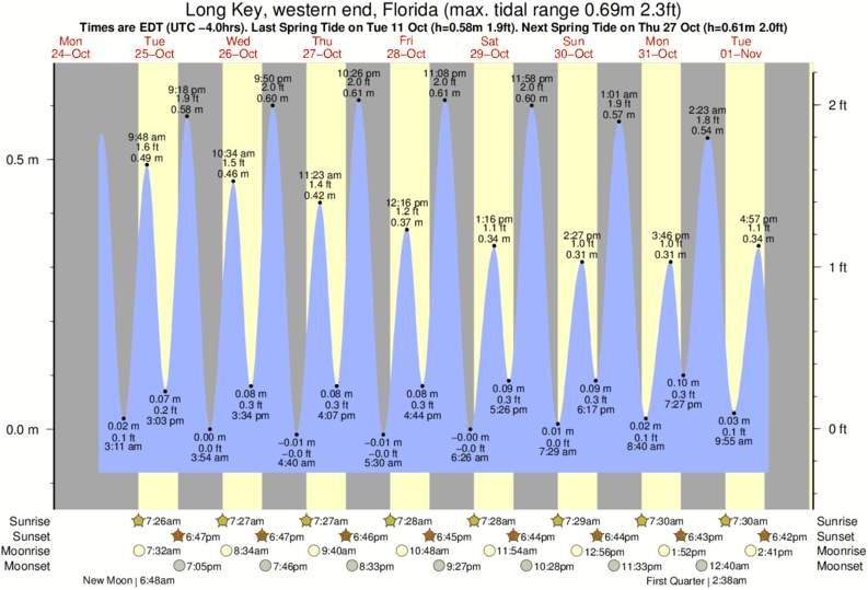 Tide Times are EST (UTC -5.0hrs). Last Spring High Tide at Long Key, western end was on Fri 05 Dec (height: 0.59m 1.9ft). Next high Spring Tide at Long Key, western end will be on Sun 21 Dec (height: 0.47m 1.5ft).