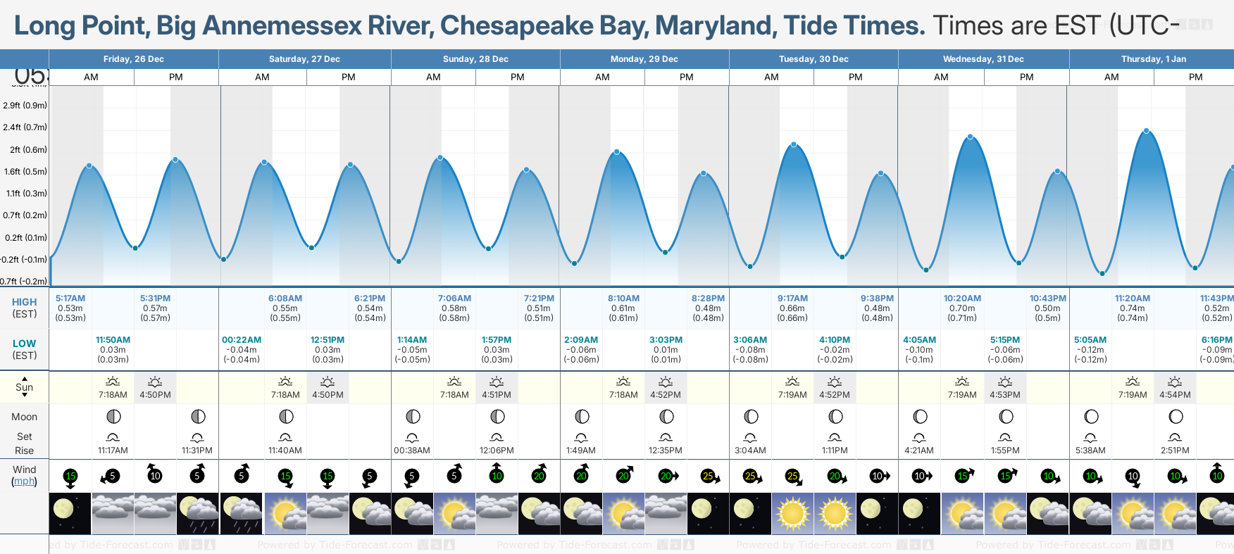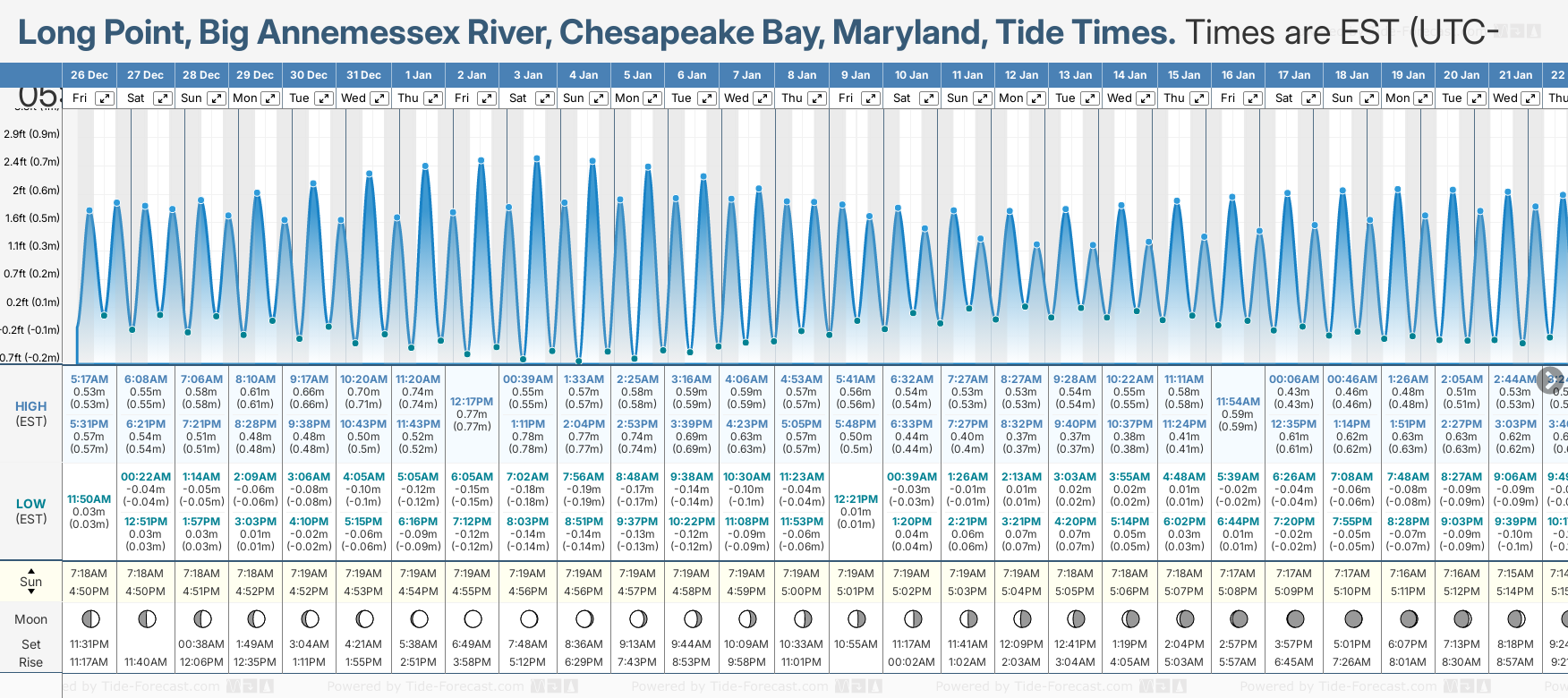 December and January Tide charts for Long Point, Big Annemessex River, Chesapeake Bay: The tide charts below show the height, time and date of high and low tides for the next 30 days.
