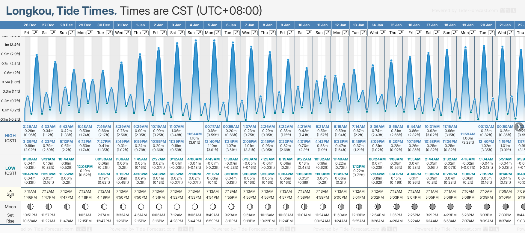 December and January Tide charts for Longkou: The tide charts below show the height, time and date of high and low tides for the next 30 days.