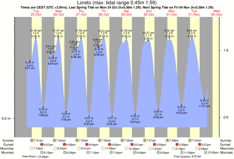 Tide Times are CET (UTC +1.0hrs). Last Spring High Tide at Loreto was on Thu 11 Dec (height: 0.40m 1.3ft). Next high Spring Tide at Loreto will be on Wed 24 Dec (height: 0.40m 1.3ft).