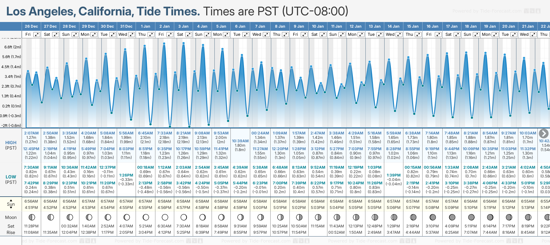 Tide chart for Los AngelesShowing low and high tide times for the next 30 days at Los Angeles. Tide Times are PST (UTC -8.0hrs).