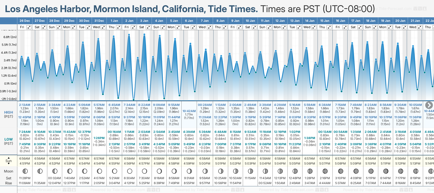 December and January Tide charts for Los Angeles Harbor, Mormon Island: The tide charts below show the height, time and date of high and low tides for the next 30 days.