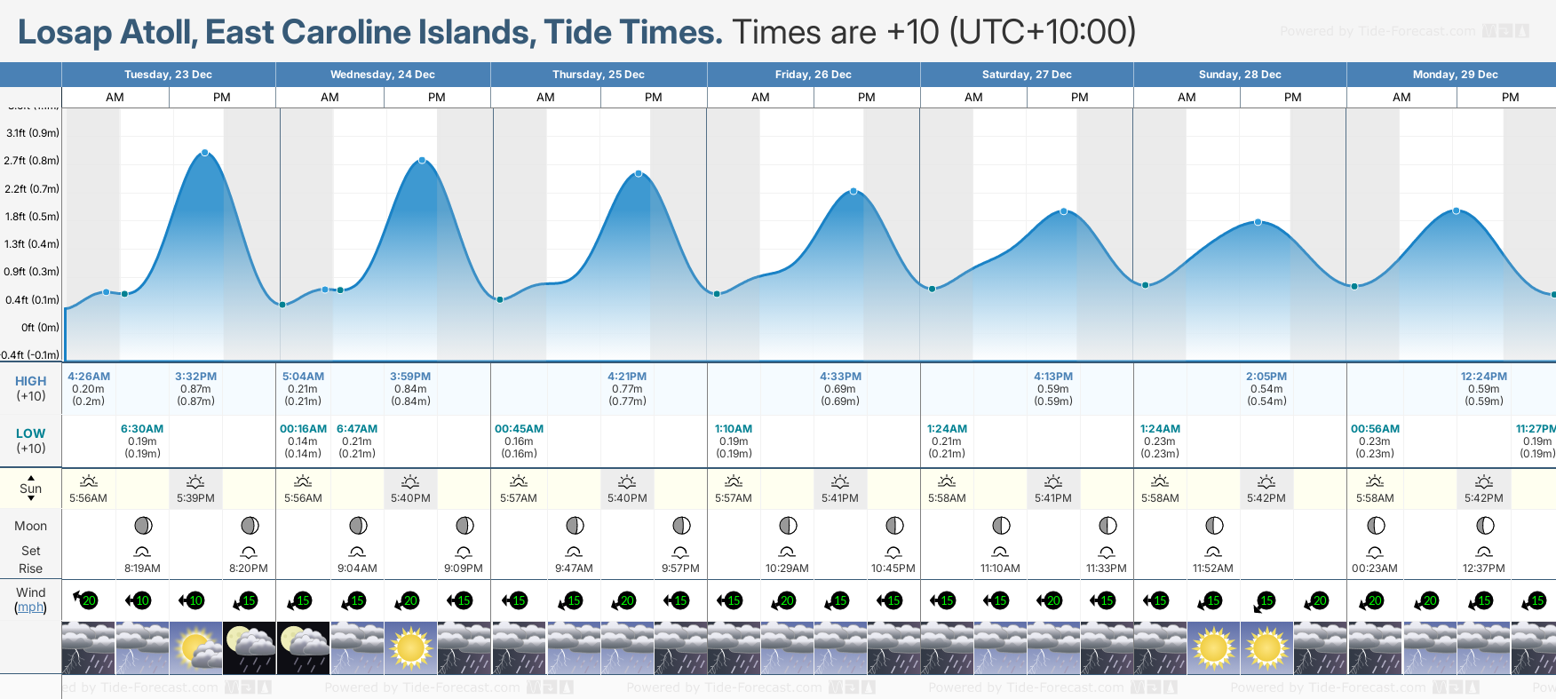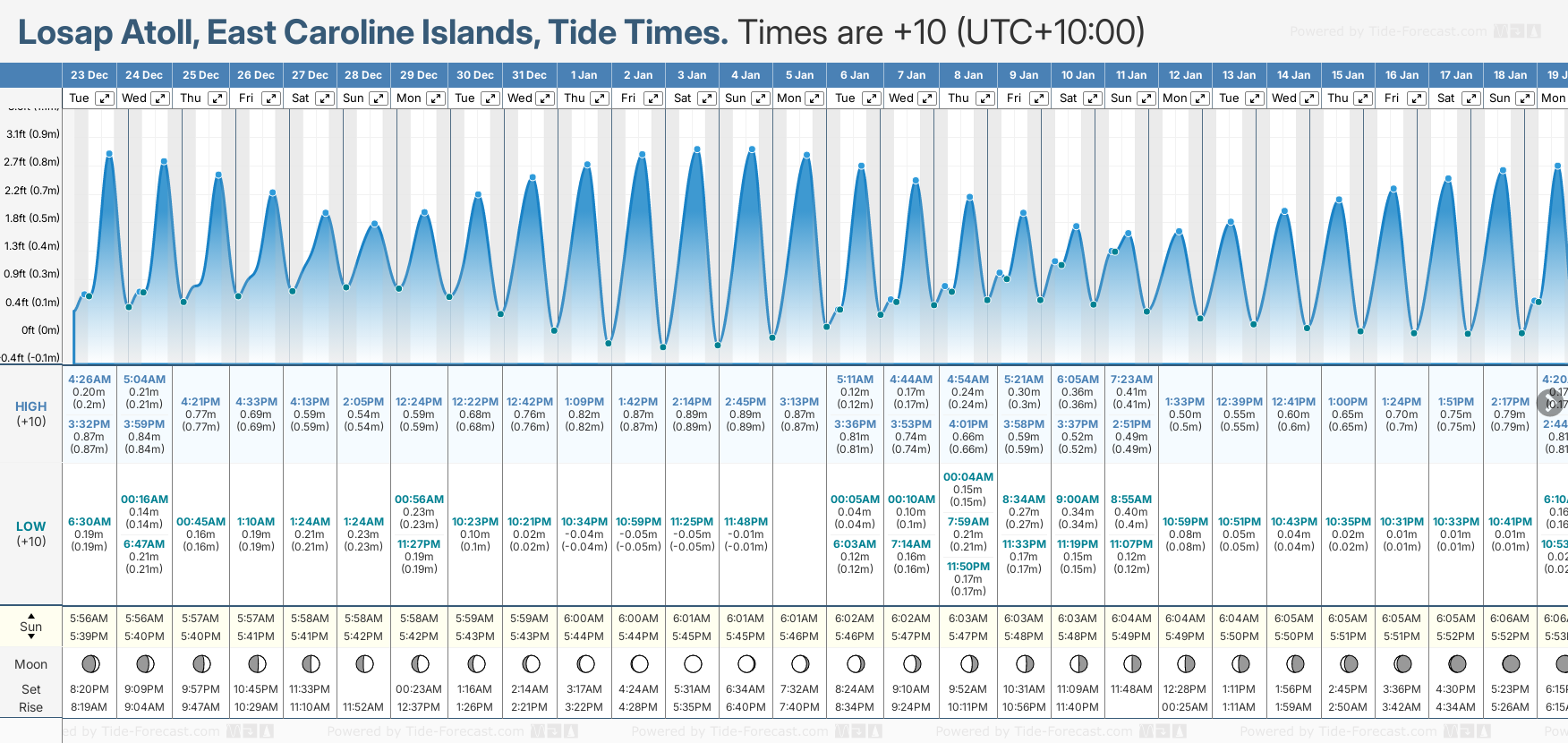 December and January Tide charts for Losap Atoll: The tide charts below show the height, time and date of high and low tides for the next 30 days.