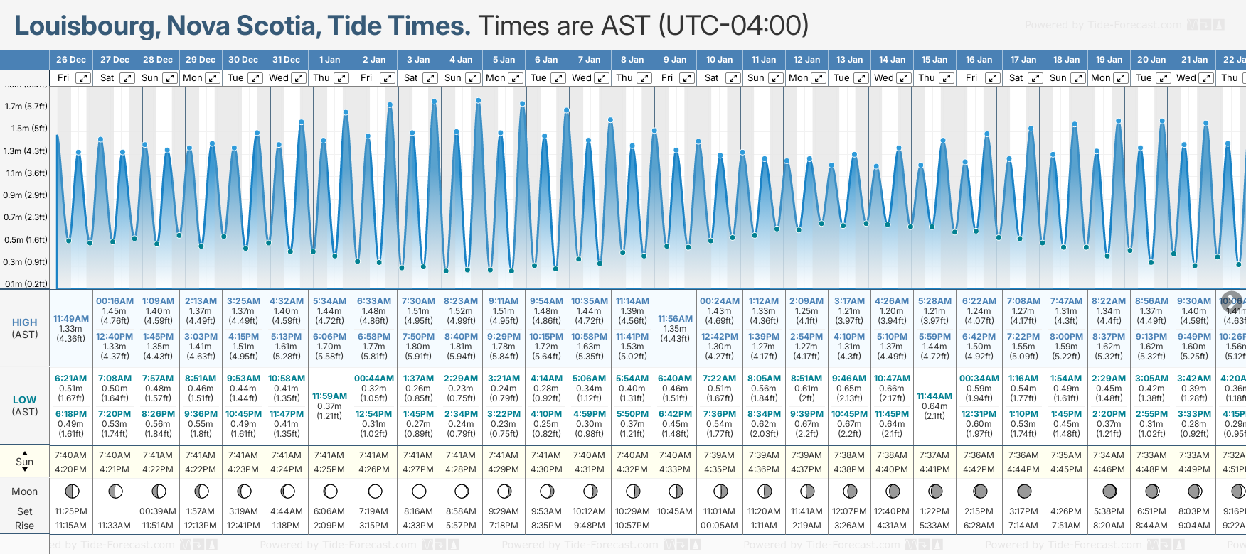 December and January Tide charts for Louisbourg: The tide charts below show the height, time and date of high and low tides for the next 30 days.