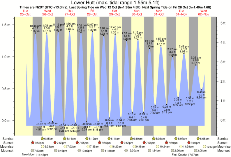 Tide Times are NZDT (UTC +13.0hrs). Last Spring High Tide at Lower Hutt was on Mon 08 Dec (height: 1.39m 4.6ft). Next high Spring Tide at Lower Hutt will be on Wed 24 Dec (height: 1.30m 4.3ft).