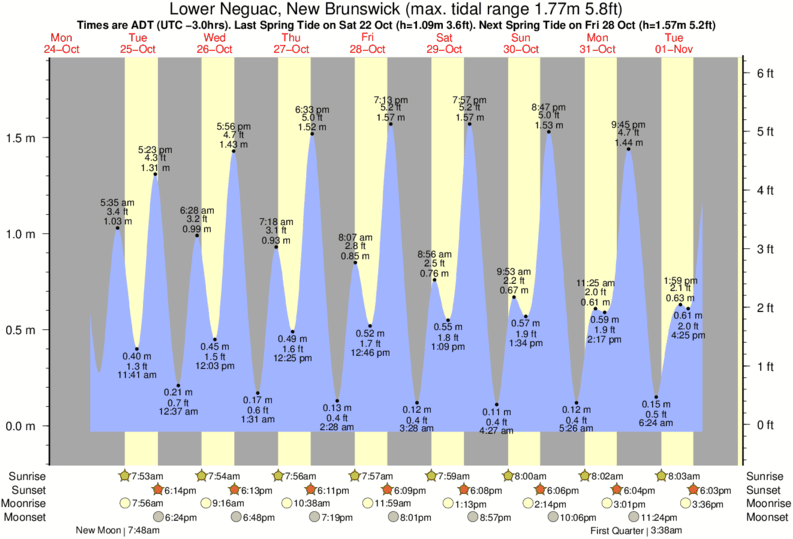 Lower Neguac tide chart key: The tide chart above shows the height and times of high tide and low tide for Lower Neguac, New Brunswick. The grey shading corresponds to nighttime hours between sunset and sunrise at Lower Neguac.
