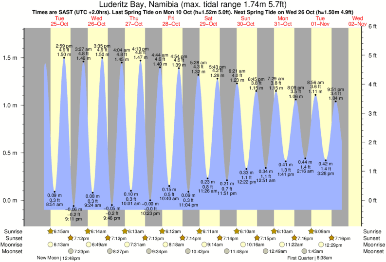 Tide Times are SAST (UTC +2.0hrs). Last Spring High Tide at Luderitz Bay was on Thu 04 Dec (height: 1.52m 5.0ft). Next high Spring Tide at Luderitz Bay will be on Mon 22 Dec (height: 1.35m 4.4ft).