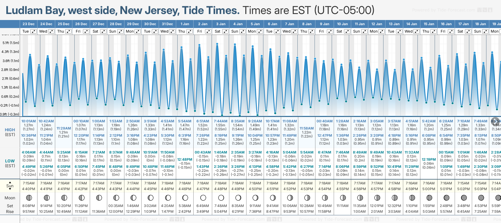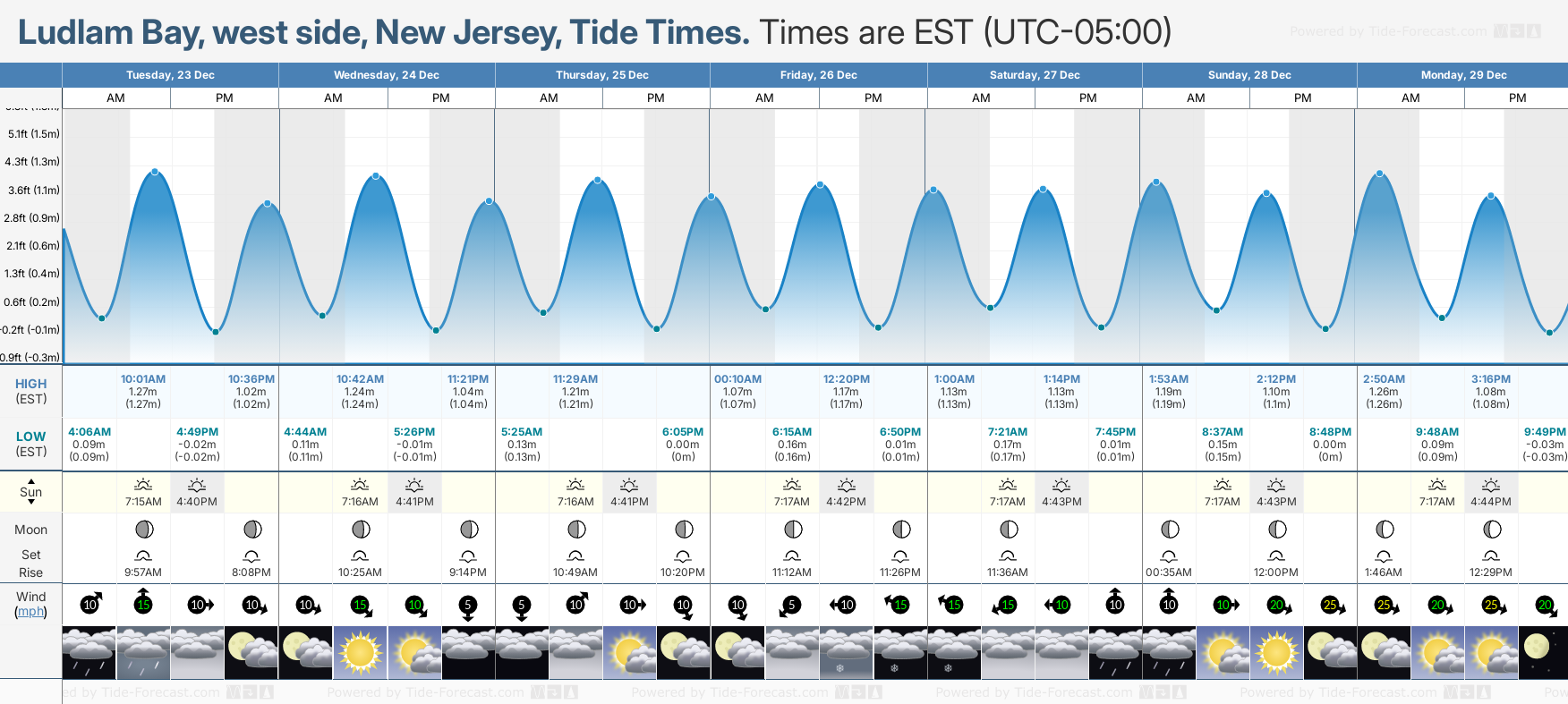December and January Tide charts for Ludlam Bay, west side: The tide charts below show the height, time and date of high and low tides for the next 30 days.