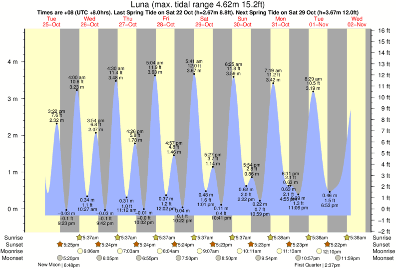 Tide Times are PST (UTC +8.0hrs). Last Spring High Tide at Luna was on Sun 07 Dec (height: 4.53m 14.9ft). Next high Spring Tide at Luna will be on Sun 21 Dec (height: 3.97m 13.0ft).