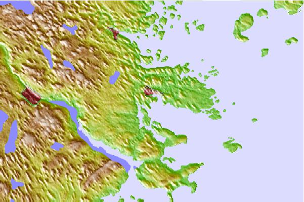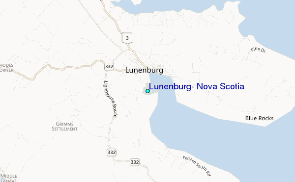 Use this relief map to navigate to tide stations, surf breaks and cities that are in the area of Lunenburg, Nova Scotia.