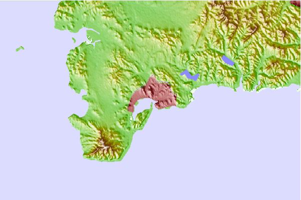 Use this relief map to navigate to tide stations, surf breaks and cities that are in the area of Lushun, China.