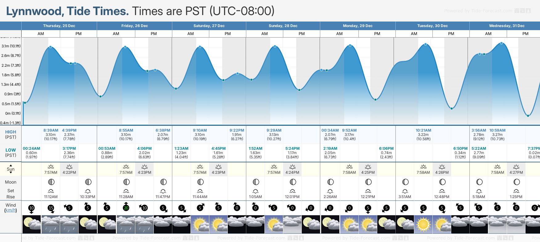 Tide Times are PST (UTC -8.0hrs). Last Spring High Tide at Lynnwood was on Mon 22 Dec (height: 3.11m 10.2ft). Next high Spring Tide at Lynnwood will be on Fri 02 Jan (height: 3.32m 10.9ft).