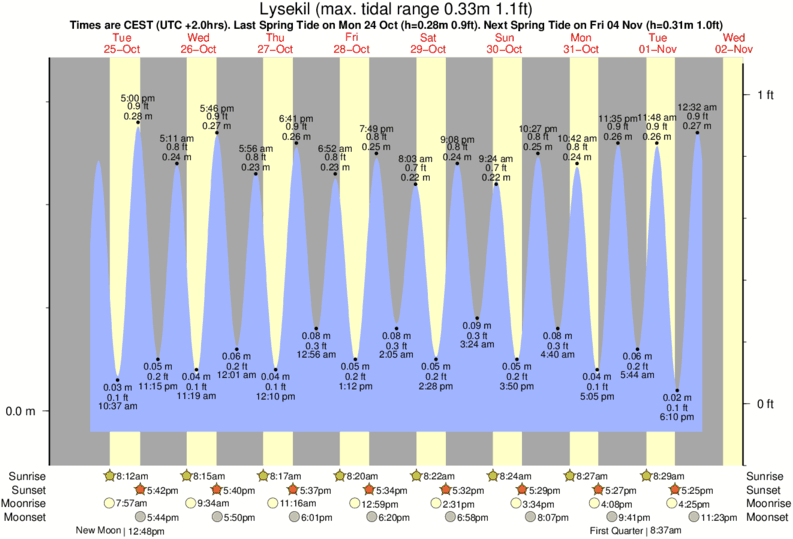 Tide Times are CET (UTC +1.0hrs). Last Spring High Tide at Lysekil was on Fri 19 Dec (height: 0.29m 1.0ft). Next high Spring Tide at Lysekil will be on Fri 02 Jan (height: 0.32m 1.0ft).