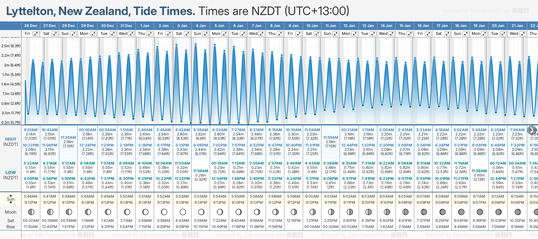 December and January Tide charts for Lyttelton: The tide charts below show the height, time and date of high and low tides for the next 30 days.