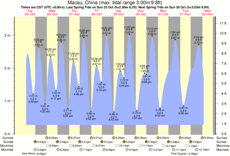 Tide Times are CST (UTC +8.0hrs). Last Spring High Tide at Macau was on Sun 07 Dec (height: 3.32m 10.9ft). Next high Spring Tide at Macau will be on Mon 22 Dec (height: 2.94m 9.6ft).