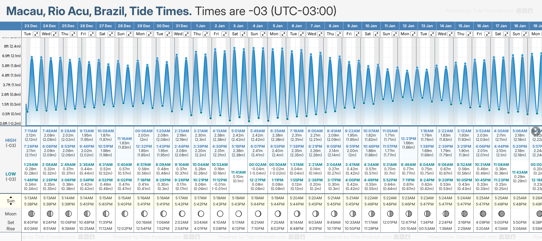 December and January Tide charts for Macau, Rio Acu: The tide charts below show the height, time and date of high and low tides for the next 30 days.