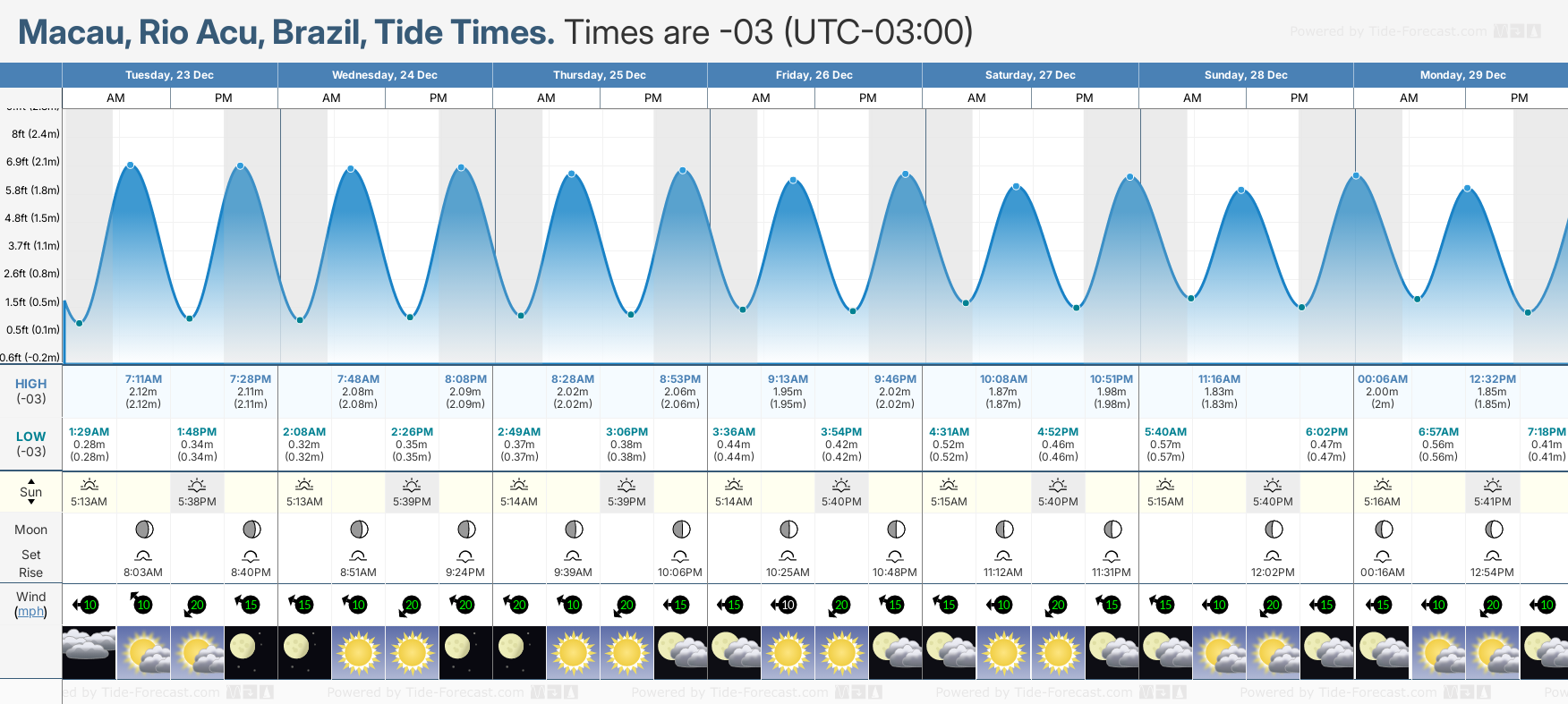 Tide chart for Macau, Rio AcuShowing low and high tide times for the next 30 days at Macau, Rio Acu. Tide Times are -03 (UTC -3.0hrs).