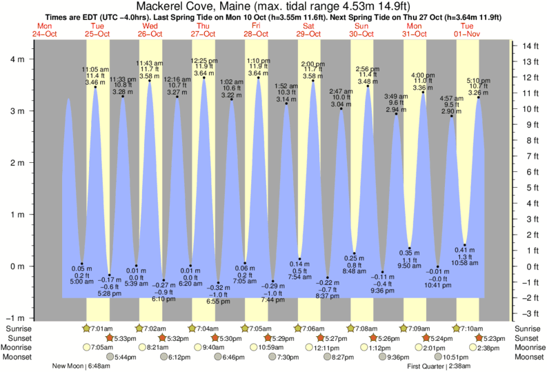 Tide Times are EST (UTC -5.0hrs). Last Spring High Tide at Mackerel Cove was on Fri 05 Dec (height: 3.93m 12.9ft). Next high Spring Tide at Mackerel Cove will be on Mon 22 Dec (height: 3.20m 10.5ft).