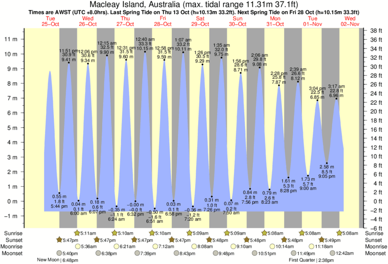 Tide Times are AWST (UTC +8.0hrs). Last Spring High Tide at Macleay Island was on Sun 07 Dec (height: 9.82m 32.2ft). Next high Spring Tide at Macleay Island will be on Tue 23 Dec (height: 8.65m 28.4ft).