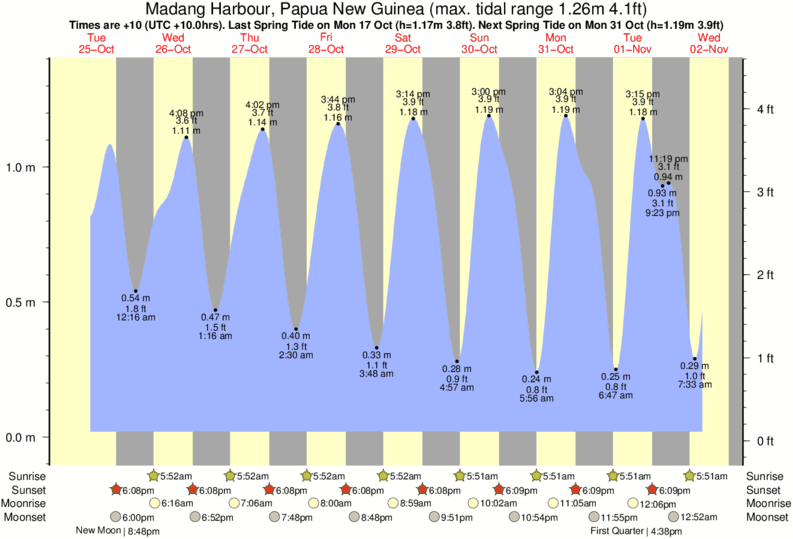 Tide chart for MadangShowing low and high tide times for the next 30 days at Madang. Tide Times are +10 (UTC +10.0hrs).
