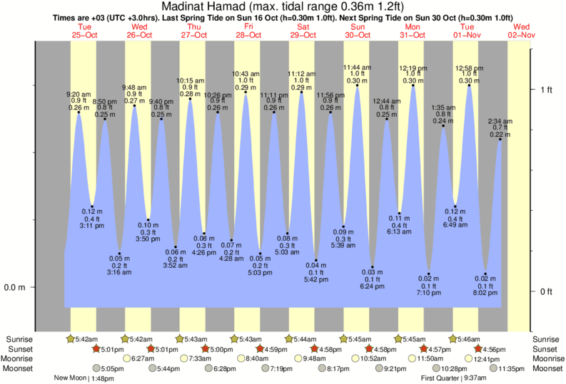 Tide Times are +03 (UTC +3.0hrs). Last Spring High Tide at Madinat Hamad was on Thu 11 Dec (height: 0.33m 1.1ft). Next high Spring Tide at Madinat Hamad will be on Tue 23 Dec (height: 0.31m 1.0ft).