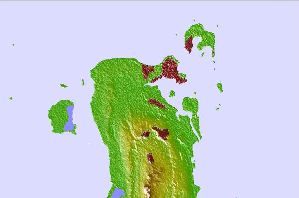 Use this relief map to navigate to tide stations, surf breaks and cities that are in the area of Madinat `Isa.