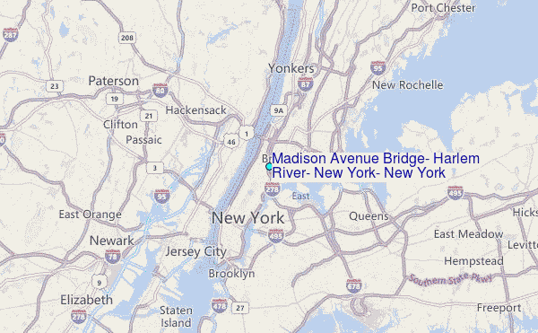 Use this relief map to navigate to tide stations, surf breaks and cities that are in the area of Madison Avenue Bridge, Harlem River, New York, New York.