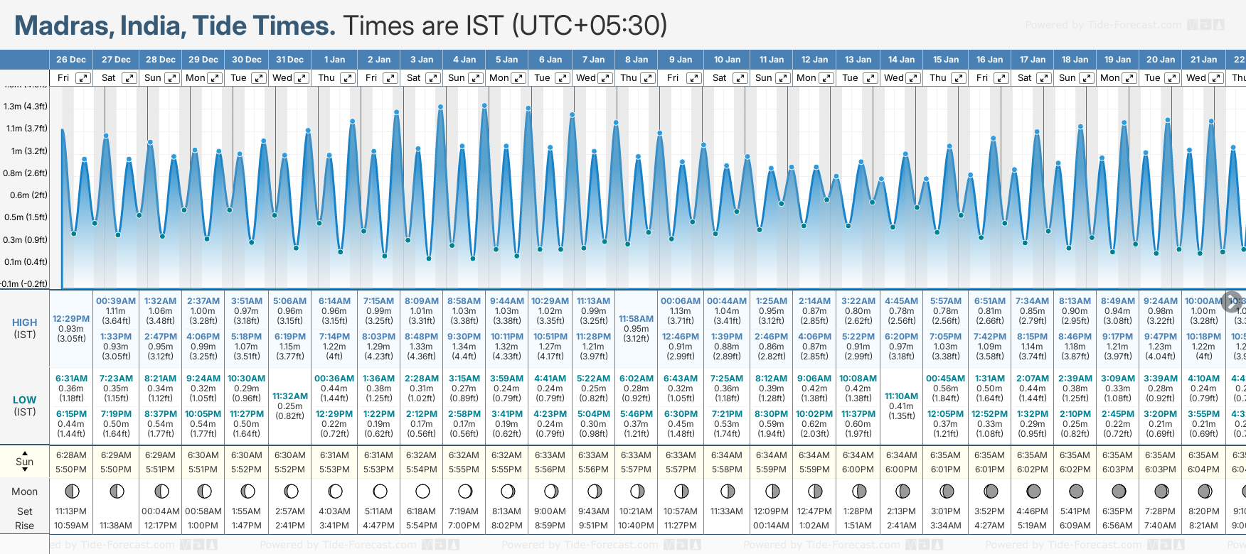 Tide chart for MadrasShowing low and high tide times for the next 30 days at Madras. Tide Times are IST (UTC +5.5hrs).