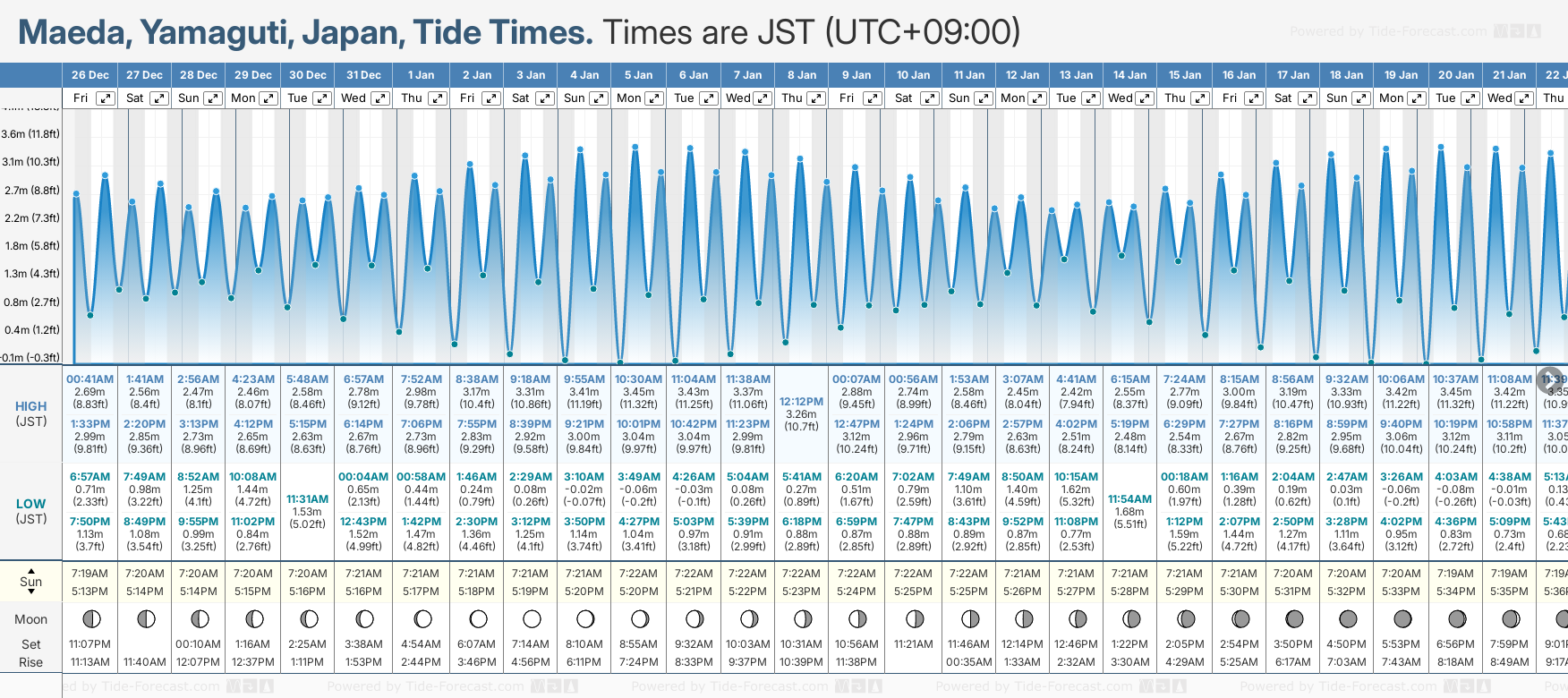 Tide Times are JST (UTC +9.0hrs). Last Spring High Tide at Maeda was on Sun 21 Dec (height: 3.45m 11.3ft). Next high Spring Tide at Maeda will be on Mon 05 Jan (height: 3.45m 11.3ft).