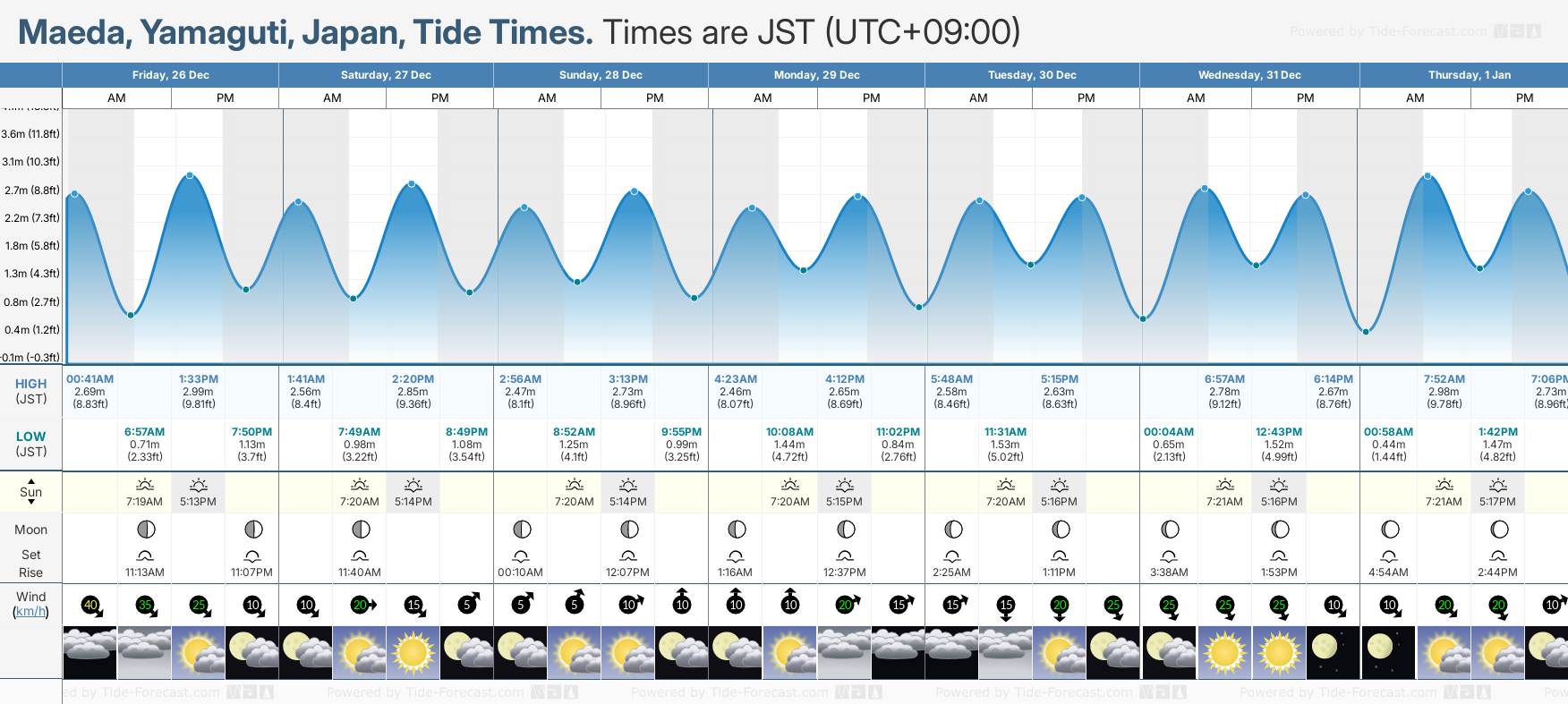 Tide chart for MaedaShowing low and high tide times for the next 30 days at Maeda. Tide Times are JST (UTC +9.0hrs).
