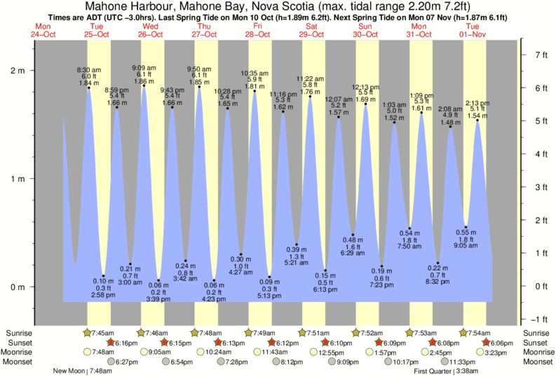 Tide chart for Mahone Harbour, Mahone BayShowing low and high tide times for the next 30 days at Mahone Harbour, Mahone Bay. Tide Times are AST (UTC -4.0hrs).