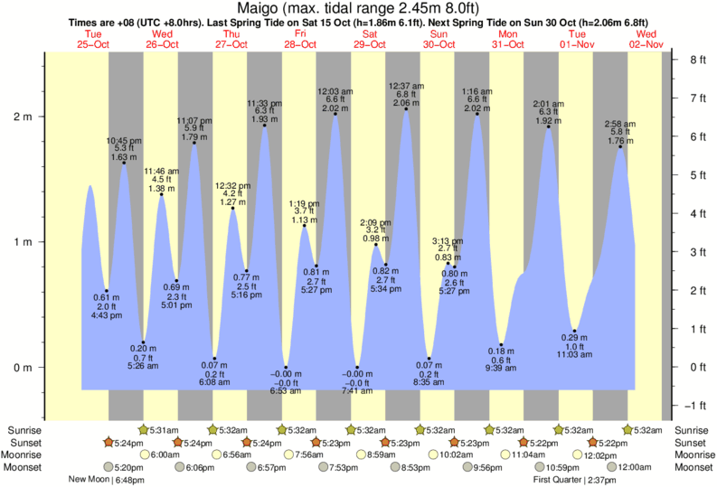 Tide Times are PST (UTC +8.0hrs). Last Spring High Tide at Maigo was on Sun 07 Dec (height: 2.27m 7.4ft). Next high Spring Tide at Maigo will be on Tue 23 Dec (height: 2.01m 6.6ft).
