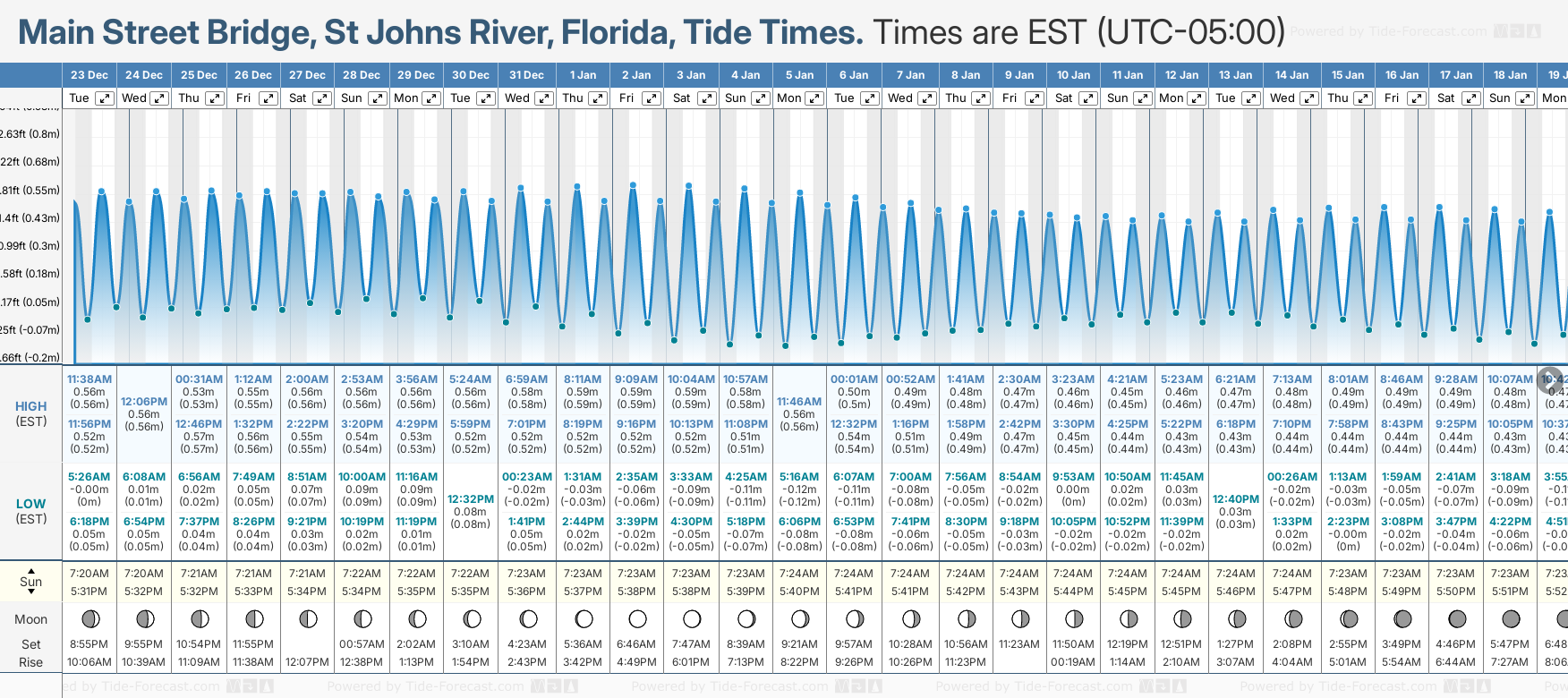 December and January Tide charts for Main Street Bridge, St Johns River: The tide charts below show the height, time and date of high and low tides for the next 30 days.