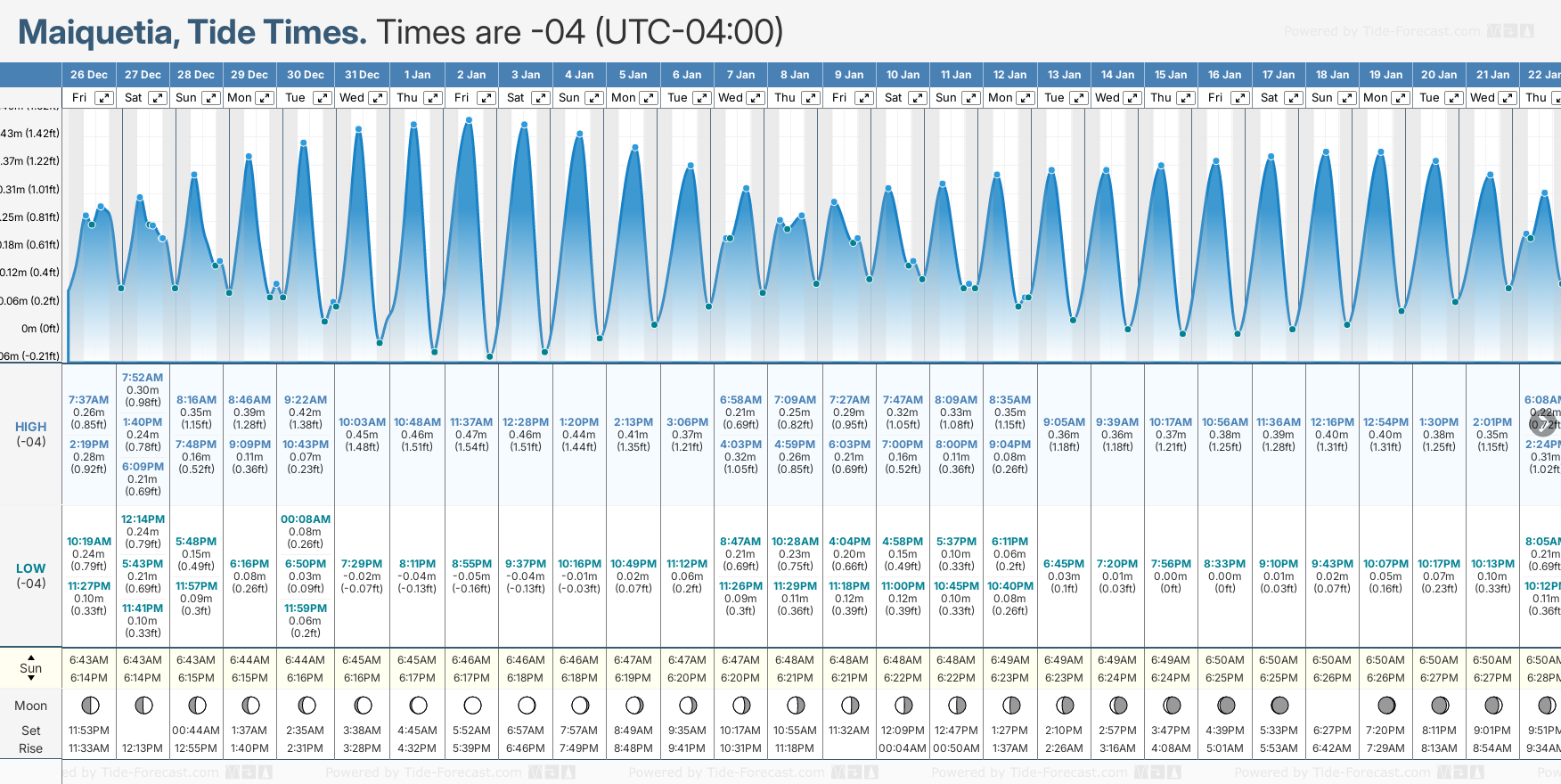 December and January Tide charts for Maiquetia: The tide charts below show the height, time and date of high and low tides for the next 30 days.
