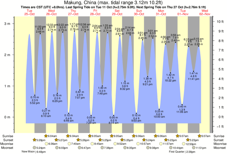 Tide Times are CST (UTC +8.0hrs). Last Spring High Tide at Makung was on Sun 07 Dec (height: 2.85m 9.4ft). Next high Spring Tide at Makung will be on Tue 23 Dec (height: 2.55m 8.4ft).