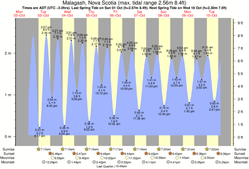 Tide chart for MalagashShowing low and high tide times for the next 30 days at Malagash. Tide Times are AST (UTC -4.0hrs).