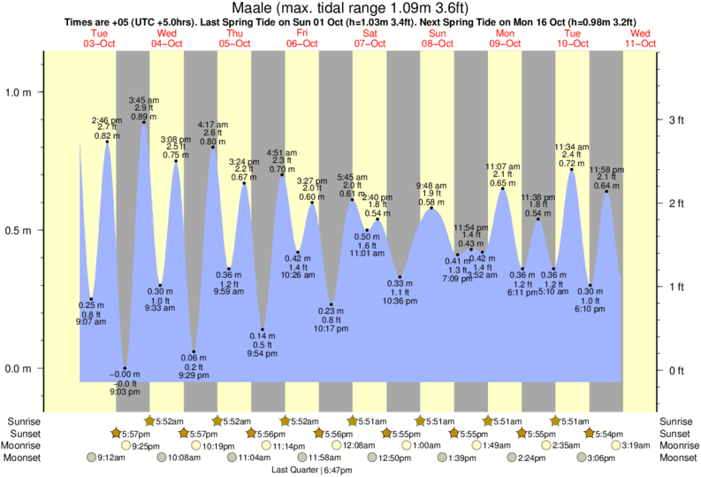 Tide Times are +05 (UTC +5.0hrs). Last Spring High Tide at Maale was on Sat 06 Dec (height: 1.01m 3.3ft). Next high Spring Tide at Maale will be on Tue 23 Dec (height: 0.94m 3.1ft).