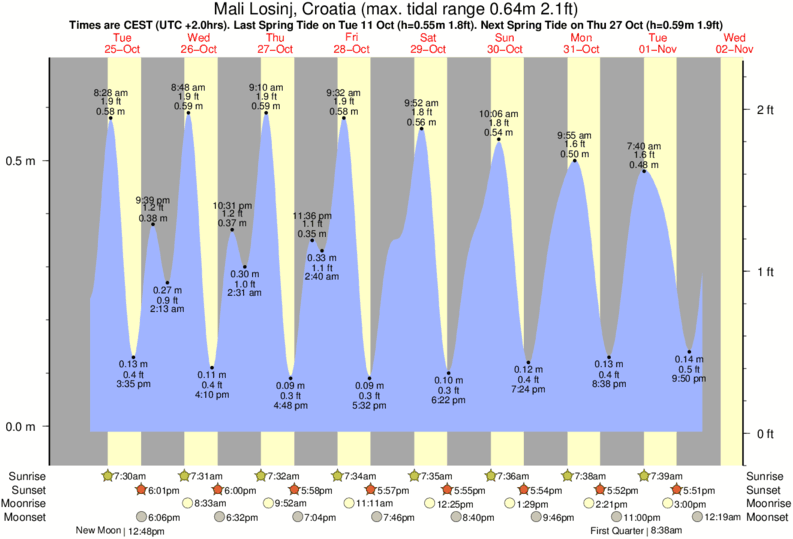Mali Losinj tide chart key: The tide chart above shows the height and times of high tide and low tide for Mali Losinj, Croatia. The grey shading corresponds to nighttime hours between sunset and sunrise at Mali Losinj.