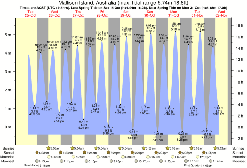 Tide Times are ACST (UTC +9.5hrs). Last Spring High Tide at Mallison Island was on Tue 09 Dec (height: 5.40m 17.7ft). Next high Spring Tide at Mallison Island will be on Wed 24 Dec (height: 4.53m 14.9ft).